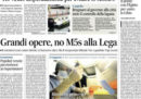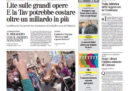 Le tensioni nel governo sulle grandi opere, con le critiche del ministro per il Sud Lezzi al progetto del gasdotto TAP difeso invece dal leader della Lega Salvini insieme alle altre opere già avviate, sono in apertura sulla maggior parte dei giornali di oggi. Il Giornale si preoccupa dei possibili tagli alle pensioni, mentre i quotidiani sportivi titolano sul ritorno al Milan con un ruolo dirigenziale dell’ex calciatore Paolo Maldini.