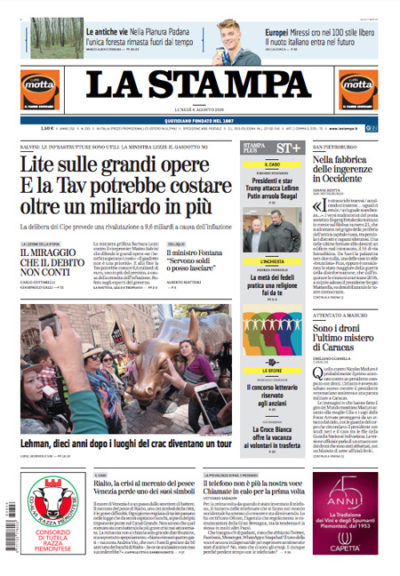 Le tensioni nel governo sulle grandi opere, con le critiche del ministro per il Sud Lezzi al progetto del gasdotto TAP difeso invece dal leader della Lega Salvini insieme alle altre opere già avviate, sono in apertura sulla maggior parte dei giornali di oggi. Il Giornale si preoccupa dei possibili tagli alle pensioni, mentre i quotidiani sportivi titolano sul ritorno al Milan con un ruolo dirigenziale dell’ex calciatore Paolo Maldini.