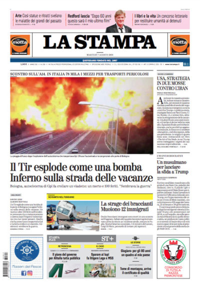 Quasi tutti i giornali di oggi aprono sull’incidente sull’autostrada A14 a Bologna, dove un’autocisterna che trasportava gpl è esplosa dopo aver tamponato altri camion in coda provocando un’esplosione che ha causato un morto e circa 70 feriti e il crollo di parte della carreggiata. Il Manifesto titola invece sull’incidente fra un furgone e un tir in Puglia nel quale sono morti dodici immigrati africani che lavoravano nei campi, Libero e il Tempo si occupano del rinvio di un anno dell’obbligo dei vaccini per l’iscrizione a scuola, e il Fatto segue le trattative fra i partiti per la nomina del nuovo presidente della RAI.