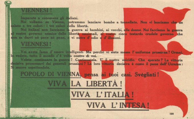 La mattina del 9 agosto 1918, sei biplani monoposto SVA e un biposto dello stesso tipo, con a bordo otto aviatori italiani, entrarono nello spazio aereo di Vienna, la capitale dell’impero austro-ungarico. Ancora non si sapeva, ma stava per finire il più esteso e tragico conflitto della storia dell’umanità, che vedeva su due fronti opposti Italia e Impero asburgico. I viennesi che scesero per strada, preoccupati dal rumore degli aerei, videro con sorpresa cadere dal cielo migliaia di volantini. Sopra c’erano scritti due diversi messaggi propagandistici italiani, che invitavano gli austriaci a smettere di combattere per l’Impero e celebravano i colori del tricolore.
