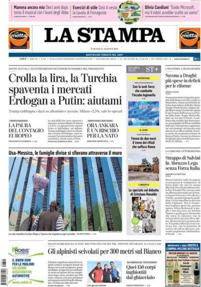 La maggior parte dei giornali apre sulla crisi dell’economia turca, con il valore della lira turca che ha perso oltre il 12% rispetto al dollaro nella giornata di ieri e circa il 30% dall’inizio dell’anno, e sulle possibili conseguenze sui mercati europei, soprattutto per i paesi che hanno maggiori investimenti in Turchia. Il Messaggero titola invece sui possibili tagli per le pensioni più alte, mentre il Fatto si occupa di quanto spende lo Stato per gli affitti.