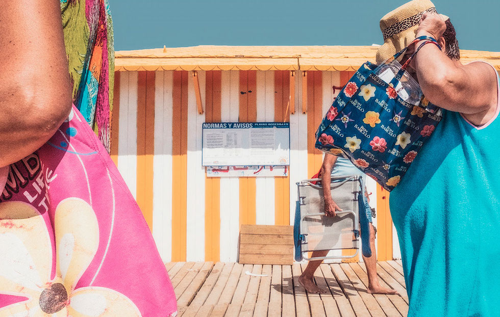 Signore che prendono il sole con occhialini protettivi, la schiena pelosa di un uomo, ombrelloni, altre signore in costumi colorati e anziane con la sabbia sotto i piedi: sono alcuni dei soggetti che la fotografa Bambi No Muere ha fotografato sulla spiaggia di Benidorm, una delle località turistiche più conosciute e affollate della Spagna.