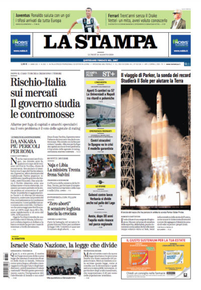In una giornata senza grandi eventi, i giornali dedicano l’apertura a notizie diverse: l’attesa per le reazioni dei mercati dopo la crisi dell’economia turca e le possibili conseguenze per l’Italia, sulle quali il Corriere della Sera intervista il vicepresidente del Consiglio Di Maio, la gestione dei richiedenti asilo da parte del ministero dell’Interno, la discussione sull’ultima trovata di Salvini sulla reintroduzione della leva obbligatoria, e i tagli alle pensioni più alte. I giornali sportivi si occupano della prima amichevole con la Juventus di Cristiano Ronaldo, autore di un gol nella partita contro la Juventus B.