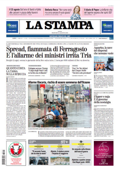 La maggior parte dei giornali di oggi apre sulla crisi economica turca e sulle conseguenze sui mercati europei e sui conti pubblici italiani, con lo spread che torna a salire raggiungendo quota 280. Il Manifesto, Avvenire e il Dubbio titolano invece sul destino della nave Aquarius della ong Sos Méditerranée, che dopo aver raccolto oltre 140 migranti nel Mediterraneo non trova un porto disponibile ad accoglierla, il Giornale e la Verità si preoccupano per i tagli alle pensioni più alte, Libero critica la proposta di Salvini per il ritorno alla leva militare obbligatoria, mentre il Messaggero e il Mattino titolano su un possibile piano del governo per l’integrazione fra Alitalia e Ferrovie.