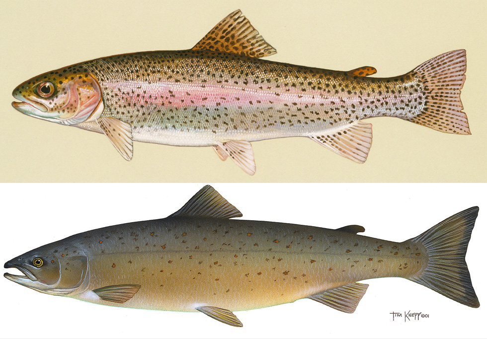 La trota salmonata (sopra) e il salmo salar (sotto)/Wikimedia, Timothy Knepp, Wikimedia