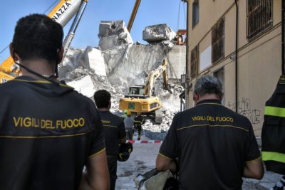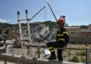 Le operazioni di soccorso tra le macerie del ponte Morandi di Genova non sono ancora state sospese. Per ora è stata accertata la morte di 38 persone, ma i soccorritori dicono che potrebbero esserci ancora tra le 10 e le 20 persone sotto le macerie. Le foto mostrano i vigili del fuoco che scavano tra i detriti e quello che resta della struttura del ponte, di giorno e di notte. Oggi sono state rese nuovamente accessibili anche le case del quartiere che si trova sotto il ponte, e che è stato completamente evacuato (il ministro Matteo Salvini ha detto ieri che le case saranno demolite, ma non è chiaro se sia stata presa qualche decisione ufficiale in materia). Gli abitanti della zona, accompagnati dai vigili del fuoco, hanno potuto raggiungere le loro case e recuperare vestiti e altri oggetti, poco alla volta.