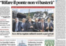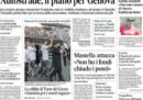 Quasi tutti i giornali di oggi titolano sull’annuncio del governo di aver avviato la procedura per la revoca della concessione a Autostrade per l’Italia con l’invio di una lettera di contestazione alla società per la responsabilità del crollo del ponte Morandi a Genova; alcuni giornali aprono invece sulle prime ipotesi sulle cause del crollo, sui funerali di stato in programma per oggi ai quali però non parteciperanno molte famiglie delle vittime, e sui possibili rischi per altri ponti in Italia. Fanno scelte diverse solo Libero, che si preoccupa per i tagli alle pensioni, e il Dubbio, che apre sui dati forniti dal ministero dell’Interno sul calo dei reati e degli sbarchi di migranti in Italia. I giornali sportivi aprono tutti sull’avvio del campionato di calcio con la prima partita di Cristiano Ronaldo con la Juventus a Verona contro il Chievo.