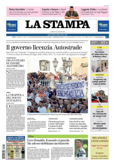Quasi tutti i giornali di oggi titolano sull’annuncio del governo di aver avviato la procedura per la revoca della concessione a Autostrade per l’Italia con l’invio di una lettera di contestazione alla società per la responsabilità del crollo del ponte Morandi a Genova; alcuni giornali aprono invece sulle prime ipotesi sulle cause del crollo, sui funerali di stato in programma per oggi ai quali però non parteciperanno molte famiglie delle vittime, e sui possibili rischi per altri ponti in Italia. Fanno scelte diverse solo Libero, che si preoccupa per i tagli alle pensioni, e il Dubbio, che apre sui dati forniti dal ministero dell’Interno sul calo dei reati e degli sbarchi di migranti in Italia. I giornali sportivi aprono tutti sull’avvio del campionato di calcio con la prima partita di Cristiano Ronaldo con la Juventus a Verona contro il Chievo.