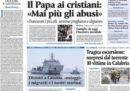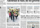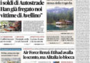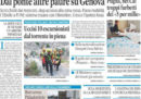 Ci sono notizie diverse in apertura sui giornali di oggi: molti seguono ancora il crollo del ponte Morandi a Genova, con le divisioni fra Lega e Movimento 5 Stelle sull’ipotesi di nazionalizzare la rete autostradale avanzata ieri in un’intervista dal ministro per le Infrastrutture Toninelli, ma alcuni titolano sull’accordo raggiunto da Asia Argento con un giovane attore che la accusava di violenza sessuale con il pagamento di 380.ooo dollari. Repubblica apre sugli escursionisti morti nel parco del Pollino per la piena di un torrente, il Manifesto segue la vicenda della nave della Marina militare Diciotti, che attraccherà a Catania anche se non si capisce quale sarà il destino dei migranti raccolti a bordo, mentre Avvenire e l’Osservatore Romano si occupano della lettera di Papa Francesco sugli abusi sessuali compiuti da membri della Chiesa.