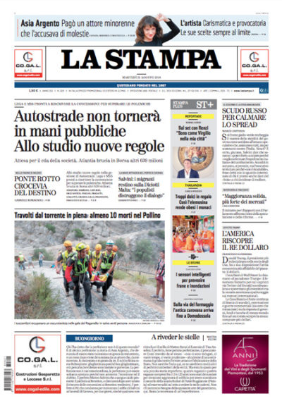 Ci sono notizie diverse in apertura sui giornali di oggi: molti seguono ancora il crollo del ponte Morandi a Genova, con le divisioni fra Lega e Movimento 5 Stelle sull’ipotesi di nazionalizzare la rete autostradale avanzata ieri in un’intervista dal ministro per le Infrastrutture Toninelli, ma alcuni titolano sull’accordo raggiunto da Asia Argento con un giovane attore che la accusava di violenza sessuale con il pagamento di 380.ooo dollari. Repubblica apre sugli escursionisti morti nel parco del Pollino per la piena di un torrente, il Manifesto segue la vicenda della nave della Marina militare Diciotti, che attraccherà a Catania anche se non si capisce quale sarà il destino dei migranti raccolti a bordo, mentre Avvenire e l’Osservatore Romano si occupano della lettera di Papa Francesco sugli abusi sessuali compiuti da membri della Chiesa.