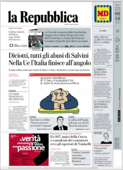 Tutti i giornali si dedicano estesamente al caso Diciotti con inchieste, interviste e analisi. Più in basso compaiono le ipotesi su come le autorità italiane intendono demolire ciò che rimane del ponte Morandi a Genova. Oggi si gioca inoltre la Serie A: sono in programma due partite interessanti come Juventus-Lazio e Napoli-Milan.