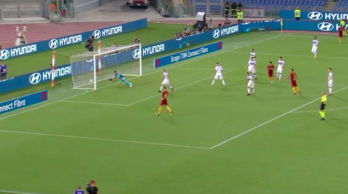 I tappetini virtuali di TIM inquadrati durante il gol di Javier Pastore in Roma-Atalanta (Sky Sport)