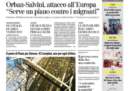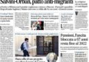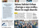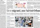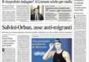 L’incontro tra Matteo Salvini e il primo ministro ungherese Viktor Orbán viene raccontato su molte prime pagine dei giornali di oggi, e affiancato su alcune alla partecipata manifestazione di ieri a Milano contro il razzismo e a favore dell’accoglienza; il tutto mentre arrivano a Rocca di Papa i 100 migranti della Diciotti accolti dalla CEI in Italia, tra le proteste dei residenti.