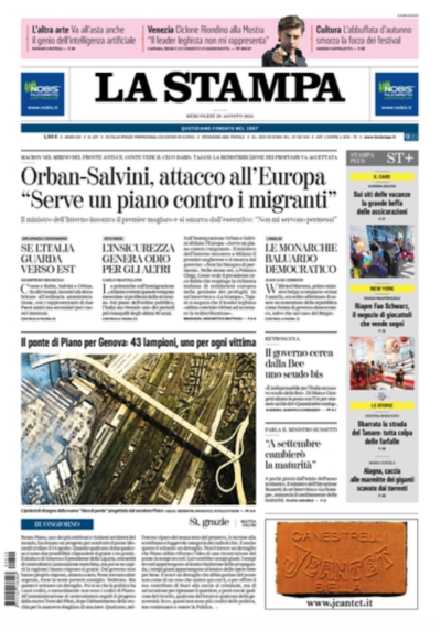 L’incontro tra Matteo Salvini e il primo ministro ungherese Viktor Orbán viene raccontato su molte prime pagine dei giornali di oggi, e affiancato su alcune alla partecipata manifestazione di ieri a Milano contro il razzismo e a favore dell’accoglienza; il tutto mentre arrivano a Rocca di Papa i 100 migranti della Diciotti accolti dalla CEI in Italia, tra le proteste dei residenti.