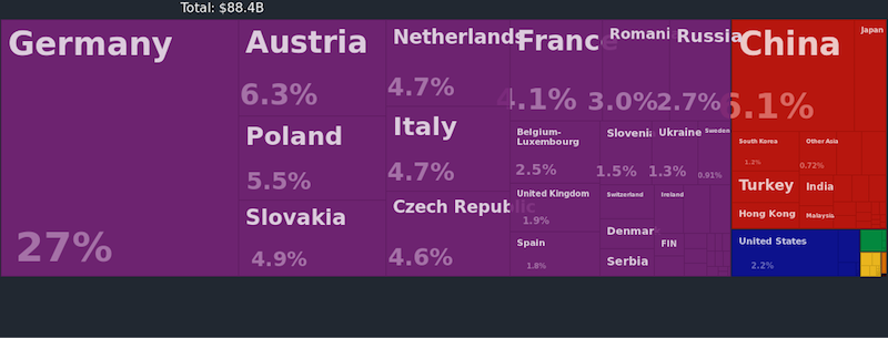Il discorso non cambia per le importazioni: questi, per esempio, sono i paesi da cui l’Ungheria ottiene la maggior parte dei prodotti che importa. I primi otto paesi fanno parte della UE.