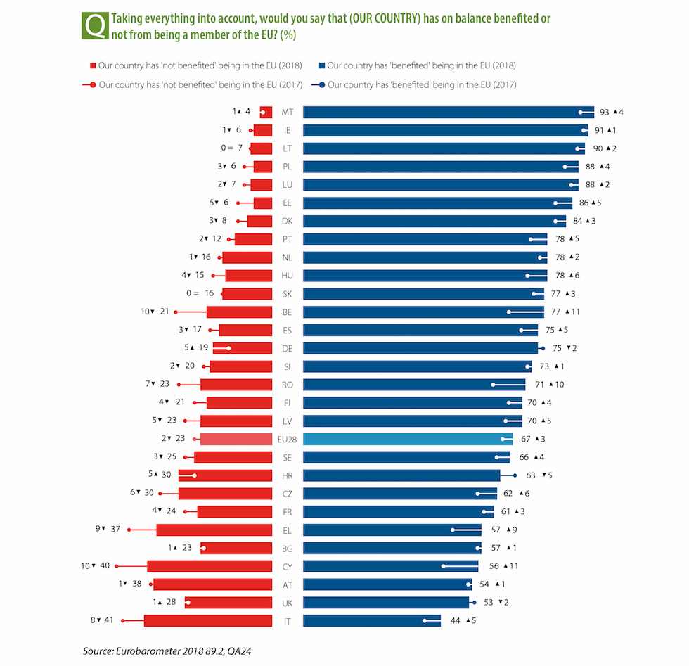 Per tutte queste ragioni i cittadini di questi paesi sono in gran parte soddisfatti di essere entrati nell’Unione, e difficilmente voteranno per partiti politici che propongono di uscirne. Secondo l’ultimo Eurobarometro, l’imponente sondaggio che ogni anno misura la popolarità delle istituzioni dell’Unione Europea, l’88 per cento dei polacchi pensa che il proprio paese abbia ottenuto benefici dall’ingresso nell’UE (una percentuale in crescita di 4 punti rispetto al 2017).