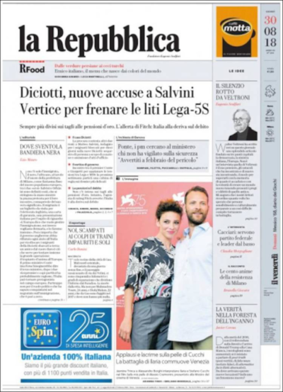 Non è stata una giornata di grandi notizie, ieri, infatti oggi ogni quotidiano va un po’ per la sua strada: chi parla del ponte di Genova, chi delle accuse contro Matteo Salvini, chi delle critiche di Emmanuel Macron al governo italiano, chi addirittura decide di aprire con una notizia di due giorni fa su DAZN, chi sulle grane in corso nella Chiesa cattolica, chi sul film su Stefano Cucchi presentato ieri a Venezia, chi…