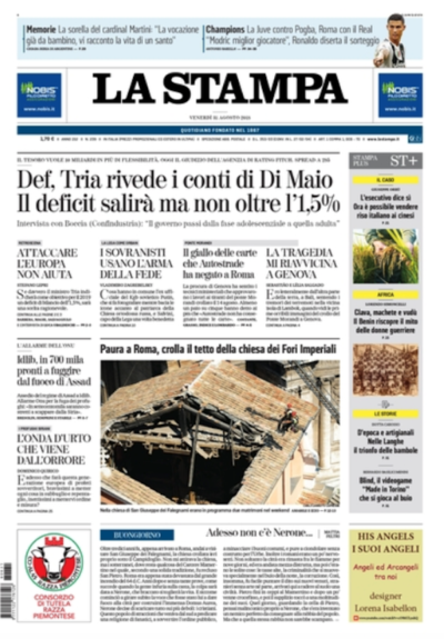 Il Corriere ha uno scoop o presunto tale, in prima pagina, sulle intenzioni – e la necessità – di Matteo Salvini di fondare un nuovo partito; ma poi mette l’articolo a pagina 9, non si capisce bene perché. Gli altri fanno ancora fatica a trovare notizie significative sia tra la politica che tra le vicende collegate – la questione Autostrade, per esempio – e quindi alcuni hanno risolto l’incertezza usando delle foto molto grandi della chiesa il cui tetto è crollato ieri nel centro di Roma. Per il resto, i sorteggi dei gironi della Champions League.