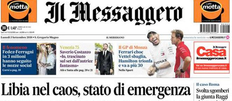 Ci sono notizie diverse in apertura sui giornali di oggi: alcuni titolano sulla situazione in Libia, dove il primo ministro Serraj ha indetto lo stato di emergenza per contrastare le azioni dei ribelli contro il suo governo, altri si occupano della prossima manovra economica del governo e dei tentativi del ministro dell’Economia Tria di rassicurare i mercati sul mantenimento dei parametri richiesti dall’Unione Europea, Repubblica apre sulle modifiche proposte dal governo alle leggi sugli appalti, e il Giornale si preoccupa dell’ipotesi di cambiamento delle norme sull’interruzione di gravidanza. I giornali sportivi si dividono fra la vittoria di Hamilton nel Gran Premio di Formula 1 a Monza e la sconfitta in campionato del Napoli contro la Sampdoria.