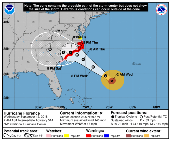 L’uragano Florence continua a rafforzarsi mentre sorvola l’oceano Atlantico, diretto verso la costa sud-est degli Stati Uniti. Da alcuni giorni è di categoria 4 (su 5) con venti che raggiungono i 225 chilometri orari. Secondo le previsioni, periodicamente riviste dagli esperti del Centro Nazionale Uragani degli Stati Uniti, Florence potrebbe arrivare sulla terraferma nelle prime ore di venerdì e non giovedì come era stato calcolato in precedenza. La perturbazione è comunque molto grande e sono previste piogge e forti venti entro 48 ore, soprattutto sul North Carolina e South Carolina. Nella notte tra martedì e mercoledì, Florence è arrivato a meno di 1.000 chilometri di distanza dalla costa statunitense. Una volta raggiunta la terraferma dovrebbe rallentare e indebolirsi.