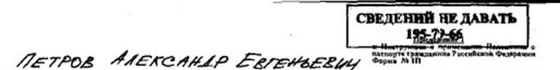 I due siti sono entrati prima in possesso dei documenti di Petrov, notando diverse cose inusuali. Primo: lo spazio nella pagina dove devono essere indicati i documenti d’identità precedenti e gli altri documenti identificativi era stato lasciato in bianco, come se prima del 2009 – anno di rilascio del documento d’identità – Alexander Yevgenievich Petrov non fosse mai esistito. Secondo: su un altro documento del dossier c’era un timbro con la scritta: «Non si fornisce alcuna informazione», un tipo di timbro che non esiste nei dossier dei documenti identificativi civili normali. Terzo: sui documenti c’era anche una nota scritta a mano che diceva S.S., abbreviazione di di “sovershenno sekretno”, espressione russa per top secret.