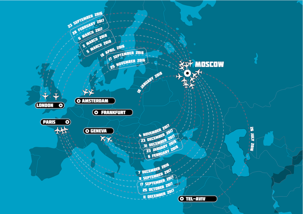 I viaggi compiuti da Petrov e Borishov da metà 2016 ad oggi (Bellingcat)