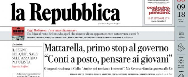 I promemoria del presidente della Repubblica Sergio Mattarella su cosa dice la Costituzione per quanto riguarda il debito e i conti dello Stato, su molte prime pagine nazionali di oggi. Repubblica ha una delle colorate foto dalle proteste a Barcellona, mentre il Sole 24 Ore intervista il ministro dell’Economia Giovanni Tria. Poi molto calcio, con la Juventus che ha battuto il Napoli e la Roma che ha battuto la Lazio, in campionato.