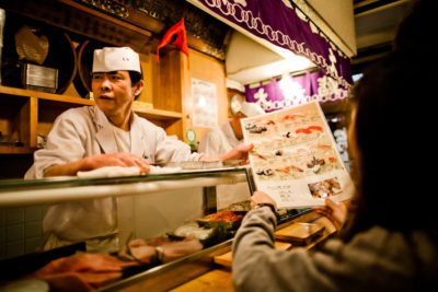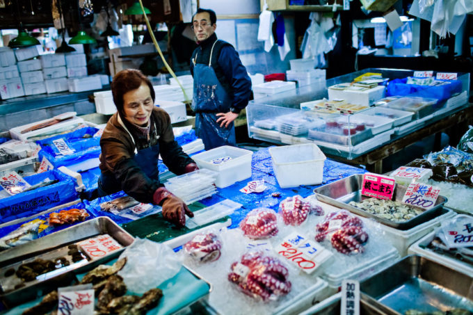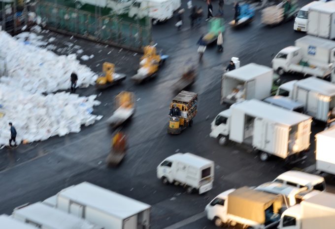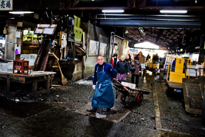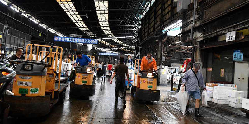 Tsukiji si trova nell’area centrale di Tokyo, a poca distanza dal ricco quartiere di Ginza, con i suoi negozi, ristoranti e aree commerciali di lusso. Il lavoro nel mercato inizia molte ore prima dell’alba, quando camion e furgoni trasportano il pescato del giorno proveniente dal porto. Le casse di pesci, di ogni specie e forma, sono ammassate nella grande area di interscambio all’esterno dell’edificio principale, e vengono poi caricate su rumorosi carrelli a motore per essere trasportate all’interno e raggiungere i banchi dei venditori. Il lavoro prosegue freneticamente fino a metà mattina, quando la maggior parte del pesce è stata venduta e lascia nuovamente il mercato, su furgoni più piccoli.