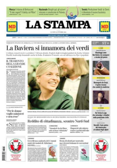 Le due notizie principali in apertura sui quotidiani di oggi sono i risultati delle elezioni in Baviera, con il calo consistente della CSU guidata dal ministro dell’Interno tedesco Seehofer e il successo dei Verdi, e ancora le discussioni sulla manovra economica, con la ricerca di un accordo nel governo per trovare le risorse e finanziare le varie proposte di Lega e Movimento 5 Stelle. Il Fatto titola sui movimenti nel Partito Democratico, Libero difende Salvini dagli attacchi, e i giornali sportivi festeggiano la vittoria dell’Italia in Polonia in una partita della Nations League.