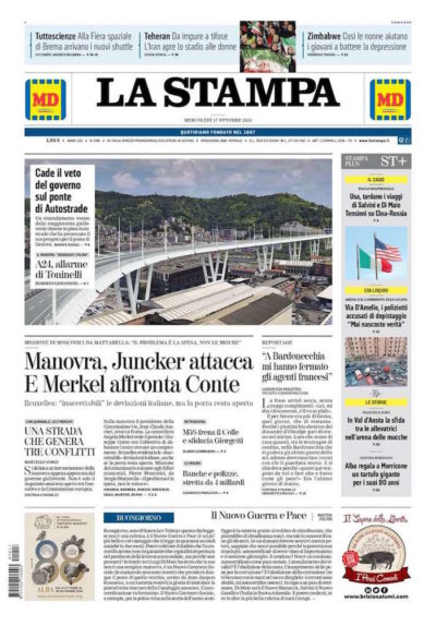 Sui giornali si parla ancora della manovra finanziaria per il 2019 presentata lunedì sera dal governo, e delle novità che introduce (dal cosiddetto reddito di cittadinanza al condono fiscale). La Stampa e il Secolo XIX – che fanno parte dello stesso gruppo editoriale – titolano entrambi sulla notizia che il governo avrebbe deciso di permettere ad Autostrade per l’Italia di partecipare alla ricostruzione del ponte Morandi di Genova, dopo aver sostenuto per settimane che non sarebbe stato così. Si legge poi della fine dei domiciliari per il sindaco di Riace e sui giornali sportivi si comincia a parlare della prossima giornata di Serie A, anche se siamo solo a mercoledì.