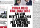 Ieri mattina sui social si leggevano molte prese in giro per Luigi Di Maio, che la sera precedente aveva ipotizzato l’esistenza una sorta di complotto per cambiare a insaputa del Movimento 5 Stelle un decreto legge in modo da inserire norme per aiutare i grandi evasori fiscali. Ieri sera, a prendere in giro Di Maio non erano solo i sagaci frequentatori di Twitter e Facebook, ma anche l’altro vicepresidente del Consiglio Matteo Salvini, che ci è andato giù abbastanza pesante e ha reso evidenti delle grosse tensioni dentro al governo: per la prima volta così chiaramente. I titoli dei giornali di oggi raccontano questo nuovo stato di fatto. Si parla di “governo a rischio”, Salvini che “umilia” Di Maio e governo che “vacilla”, per fare qualche esempio. Intanto ieri è arrivata anche la lettera della Commissione Europea sulla manovra fiscale, e anche questa notizia trova molto spazio sulle prime pagine di oggi, insieme a qualche articolo su Inter-Milan di domenica sera.