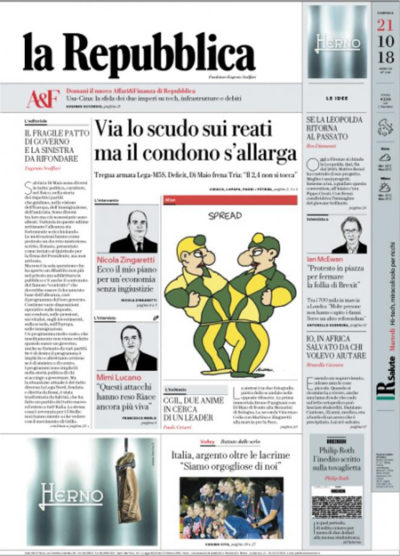 La risoluzione dello scontro di governo tra Lega e Movimento 5 Stelle è su tutte le prime pagine dei quotidiani nazionali, con definizioni diverse del condono contenuto nel decreto fiscale, a seconda dell’allineamento politico. C’è poi anche l’accusa del ministro dell’Interno Matteo Salvini sui migranti portati dalla polizia francese oltre il confine italiano. Poi c’è il derby di Milano, che finisce anche fuori dai quotidiani sportivi, e un’altra notizia del calcio italiano: la Juventus che non ha vinto la sua prima partita in stagione.