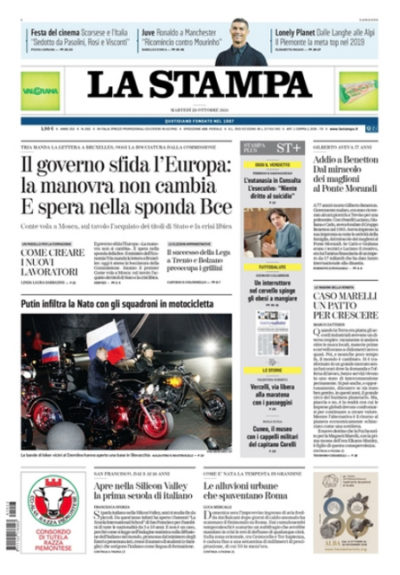 La maggior parte dei giornali di oggi segue in apertura le notizie sulla manovra economica, con la lettera inviata alla Commissione Europea da parte del ministro dell’Economia Tria per difenderla che però non dovrebbe evitare oggi la prima bocciatura ufficiale da parte dell’Unione Europea. Libero e il Manifesto titolano invece sui risultati delle elezioni provinciali in Trentino-Alto Adige, mentre i giornali sportivi presentano il ritorno della Champions League, con le partite di oggi fra Manchester United e Juventus e fra Roma e CSKA Mosca.