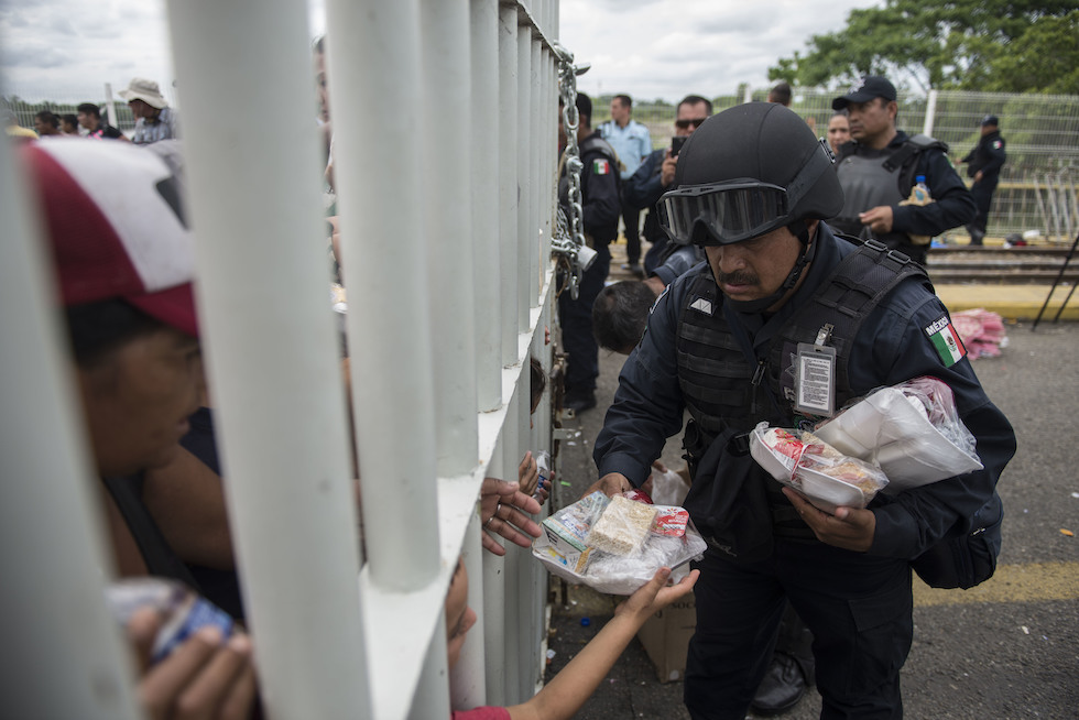 Un poliziotto messicano distribuisce cibo ai migranti dall’Honduras fermi su un ponte al confine tra Guatemala e Messico, vicino a Ciudad Hidalgo, Messico, 20 ottobre