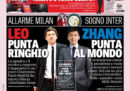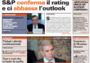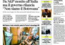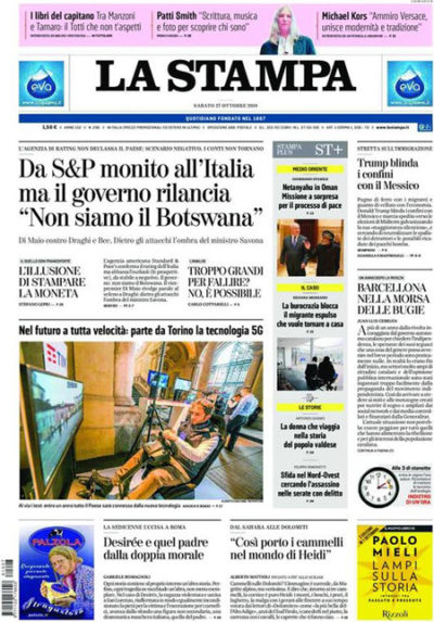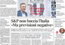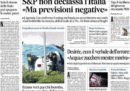 Quasi tutti i giornali di oggi si occupano in apertura della decisione dell’agenzia di rating Standard & Poor’s di mantenere invariato quello dell’Italia, modificando però le previsioni da stabili a negative, e alcuni giornali associano a questa notizia le accuse del leader del Movimento 5 Stelle Di Maio al presidente della Banca Centrale Europea Draghi di “avvelenare il clima” per le sue parole sulla crescita dello spread. Il Fatto e il Tempo aprono invece sulla storia di Desirée Mariottini, mentre il Manifesto titola sulla decisione del governo di procedere con i lavori per il gasdotto TAP, e i giornali sportivi si occupano del nuovo presidente dell’Inter, il ventisettenne cinese Zhang.