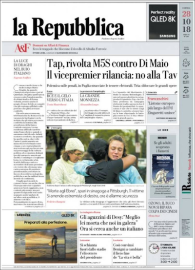 Le prime pagine di oggi si concentrano soprattutto sulle divisioni interne del Movimento 5 Stelle riguardo alla decisione del governo di procedere col gasdotto TAP in Puglia. Su alcune prime pagine trova spazio anche l’attentato in una sinagoga di Pittsburgh, nel quale sono morte almeno 11 persone. I quotidiani sportivi si occupano della vittoria della Juventus contro l’Empoli, in rimonta, grazie a due gol di Cristiano Ronaldo.