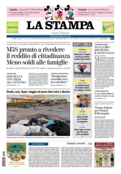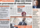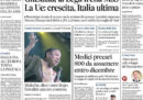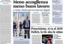 Sono due le notizie principali in apertura sui giornali di oggi: molti titolano sull’accordo raggiunto fra Lega e Movimento 5 Stelle sull’eliminazione della prescrizione dopo il processo di primo grado, che entrerà in vigore a partire dal 2020, altri aprono sulle stime della Commissione europea sul deficit e la crescita dell’Italia, peggiori rispetto a quelle del governo. La Stampa ipotizza una riduzione dei fondi destinati al reddito di cittadinanza, mentre i giornali sportivi commentano il gesto dell’allenatore del Manchester United Mourinho verso i tifosi della Juventus al termine della partita di Champions League di mercoledì.