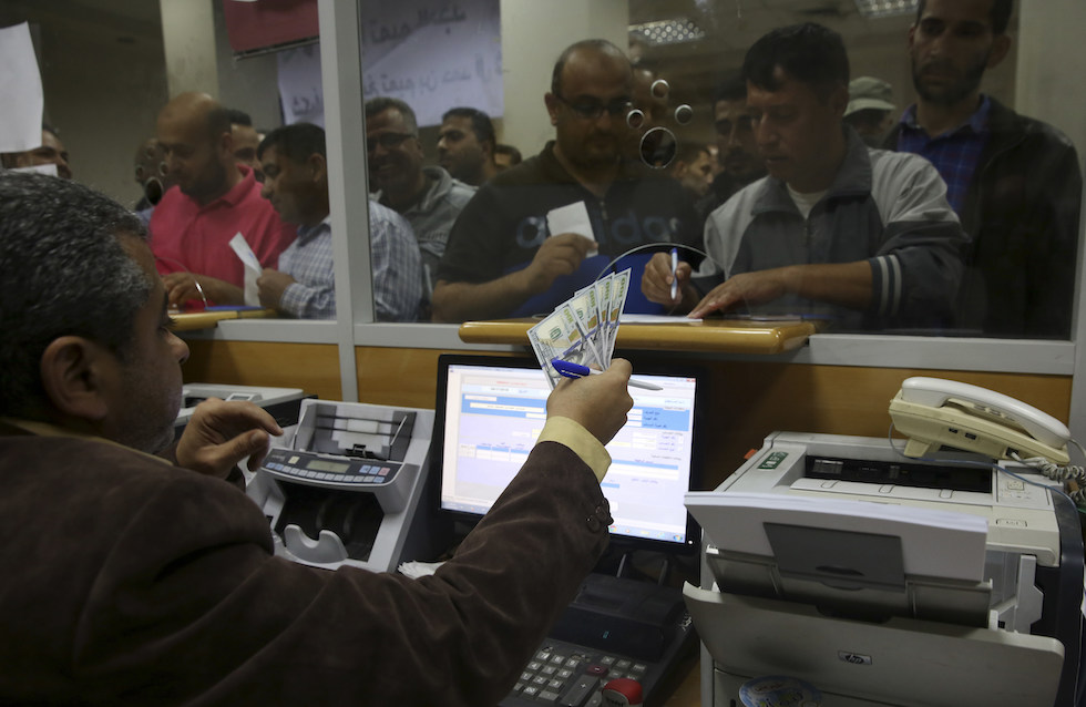 Impiegati pubblici della Striscia ricevono parte del loro stipendio a un ufficio pubblico di Gaza, 9 novembre 2018 (AP Photo/Adel Hana)