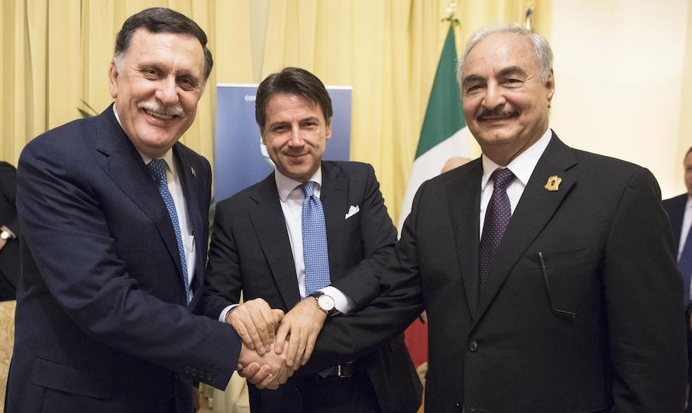 Il presidente del Consiglio italiano Giuseppe Conte, il primo ministro libico Fayez al Serraj (a sinistra) e il maresciallo Khalifa Haftar. Palermo, 13 novembre 2018 (EPA/CHIGI PALACE/FILIPPO ATTILI)