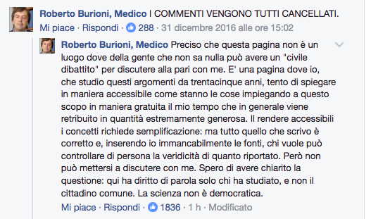In un suo commento scritto alla fine del 2016, invece, Burioni aveva fornito una spiegazione più articolata del suo “metodo”. La comunicazione scientifica, aveva scritto, non può che essere unidirezionale: parte dall’esperto e arriva alle persone. Non può esserci orizzontalità, perché soltanto gli esperti possiedono gli strumenti per spiegare questioni complesse. Il compito degli esperti è spiegare chiaramente utilizzando dati. Quello delle persone è ascoltarli e di verificare le fonti citate. Di fronte a numeri e fatti, è il punto di Burioni, non c’è spazio per dubbi o incertezze.