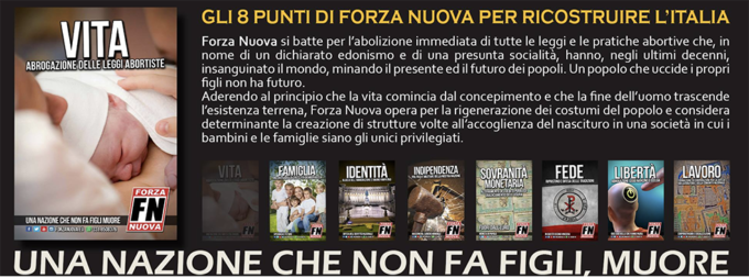 Al centro del convegno di Forza Nuova, come ha spiegato Pietro Amedeo, segretario provinciale di Forza Nuova, ci sarà l’aborto: «Il vento cristiano patriottico e rivoluzionario è entrato definitivamente in Italia e Forza Nuova spinge con forza affinché vi siano cambiamenti legislativi per eliminare l’aborto e iniziare una grande crescita demografica in Italia».