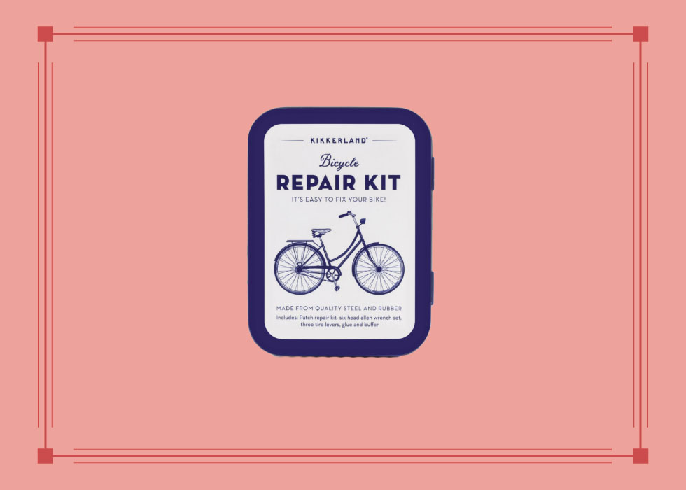 Kit per riparare la bicicletta (o meglio: per sopravvivere a una foratura). I kit sono sempre seducenti: questo di dmail è già fatto, è abbastanza completo, ha una scatola non male e costa 18 euro. Se però la scatola non vi piace e preferite scegliere voi il contenitore mettendo insieme il kit personalmente, vi diamo qualche autorevole dritta per il contenuto. Consigliamo questa colla con toppe (5 euro), e queste leve (7 euro) per smontare gli pneumatici. Per la scatola o bustina in cui metterli, dovete pensarci voi, a noi non dispiace questa a righe. (18 euro, quello già fatto)