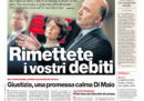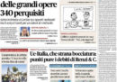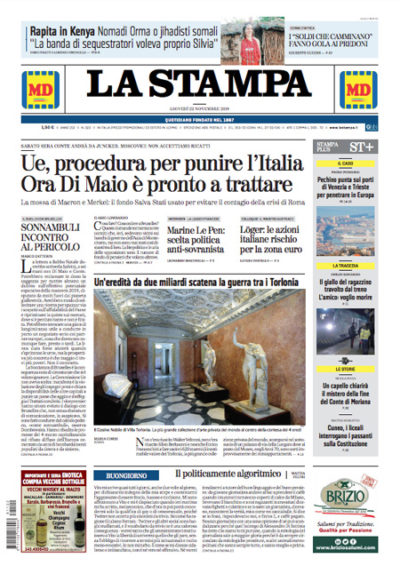 Tutti i giornali di oggi si occupano in apertura della richiesta della Commissione Europea di aprire la procedura di infrazione contro l’Italia per la manovra economica che non rispetterebbe i parametri europei sulla riduzione del debito e metterebbe a rischio la stabilità economica italiana; le reazioni nel governo cambiano a seconda dei giornali, con alcuni che sostengono che la Lega vorrebbe aprire una trattativa per le modifiche ma il Movimento 5 Stelle si opporrebbe, altri secondo i quali sarebbe vero il contrario, e altri ancora per cui non ci sarebbe nessuna intenzione di trattare.