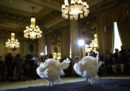 L’animale protagonista della raccolta fotografica di questa settimana è il tacchino: due esemplari sono stati presentati prima di essere graziati dal presidente degli Stati Uniti per il Ringraziamento, come vuole la tradizione, e ne segnaliamo l’impostazione della foto, con i riflettori puntati addosso e le persone intorno a loro come a ogni photocall cinematografico. Poi ci sono uno stormo di storni nel cielo di Roma, per gli appassionati di una di queste cose; una foto un po’ inquietante di un cormorano (realizzata grazie a una lunga esposizione); pettinature canine e piccoli molluschi.
