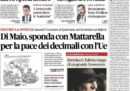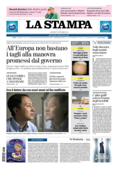 Quasi tutti i giornali di oggi si occupano in apertura delle ipotesi di modifica alla manovra economica allo studio del governo, che prevederebbero maggiori investimenti e riduzione delle spese, per evitare la procedura di infrazione da parte dell’Unione Europea; a questo i giornali associano le prime reazioni positive in Borsa e il calo dello spread. Il Manifesto apre invece sulla morte di Bernardo Bertolucci, a cui tutti i quotidiani dedicano spazio in prima pagina, il Giornale e il Tempo titolano sulle vicende che riguardano la ditta del padre di Di Maio, e Avvenire segue l’annuncio di un ricercatore cinese che avrebbe creato due gemelle modificate geneticamente. I giornali sportivi presentano le partite di Champions League di oggi e domani di Juventus, Roma, Inter e Napoli.