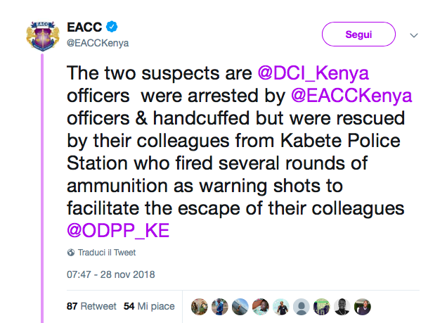 In Kenya dei poliziotti hanno aiutato a fuggire due colleghi che erano stati arrestati per corruzione
