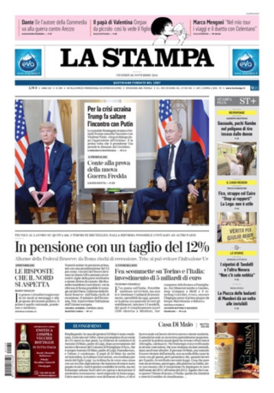 Sono diverse le notizie in apertura sui giornali di oggi: alcuni si occupano delle ipotesi di modifica alla manovra economica, soprattutto su pensioni e reddito di cittadinanza, per ridurre il rapporto fra deficit e PIL e cercare di evitare la procedura di infrazione dell’Unione Europea, altri seguono la preparazione al G20 in Argentina e l’annuncio del presidente degli Stati Uniti Trump di non voler incontrare il presidente russo Putin per le tensioni fra Russia e Ucraina. Il Giornale, il Mattino e il Tempo aprono sulle vicende che riguardano il padre di Di Maio, il Manifesto titola sulle indagini per la morte di Giulio Regeni, e Libero e la Verità vorrebbero che l’INPS spendesse meno per gli immigrati.