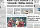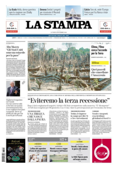 La trattativa con l’Unione Europea sulla manovra economica per evitare la procedura di infrazione è in apertura su quasi tutti i giornali di oggi, che ipotizzano l’apertura del governo a modificarla portando il rapporto fra deficit e PIL al 2% e rinviando gli interventi su pensioni e reddito di cittadinanza. La Stampa titola sulla ricerca di un accordo sul clima da parte dell’ONU, mentre i giornali sportivi aprono sui risultati della domenica di campionato, con il pareggio fra Roma e Inter e le polemiche per un rigore non dato alla Roma, e la vittoria del Milan che si porta al quarto posto in classifica.