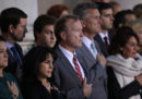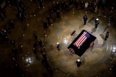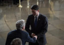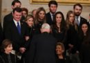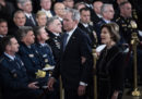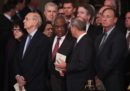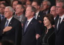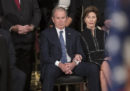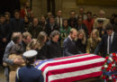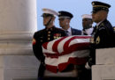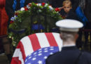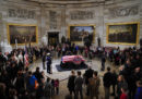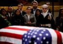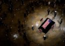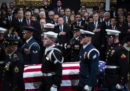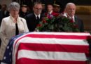 Lunedì 3 dicembre la bara con il corpo dell’ex presidente americano George H.W. Bush – morto venerdì 30 novembre a 94 anni – è stata portata alla Rotonda del Campidoglio a Washington, dove resterà esposta fino a mercoledì mattina, quando ci saranno i funerali alla National Cathedral. Il giorno dopo la bara verrà trasferita nuovamente a Houston, in Texas, per la sepoltura. Alla cerimonia per l’arrivo del feretro c’era la famiglia Bush – a partire dall’ex presidente George W. Bush (figlio di George H.W. Bush) e da sua moglie Laura – e anche importanti esponenti del governo americano, come il vicepresidente Mike Pence o lo speaker della Camera Paul Ryan. Anche il presidente Donald Trump e la moglie Melania hanno fatto visita alla bara in Campidoglio.