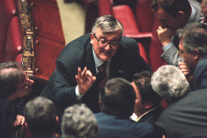 Mario Borghezio istruisce alcuni deputati leghisti alla Camera nel 1996 (AP Photo/Giulio Broglio)
